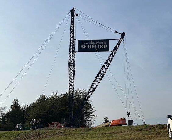 The new sign was mounted on the derrick Thursday morning, marking the near completion of a project undertaken by the city of Bedford to refurbish the derrick and sign.