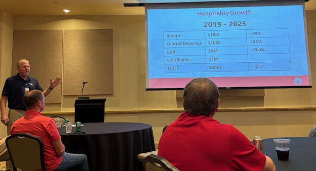 Hospitality revenue, which includes rooms, food & beverage, golf and spa/stables, has grown by 47%, or $30 million between 2019-2025. Golf has seen the most growth, up 200%, or $9 million, since 2019. The growth coming out of the pandemic “has been astounding,” he said.