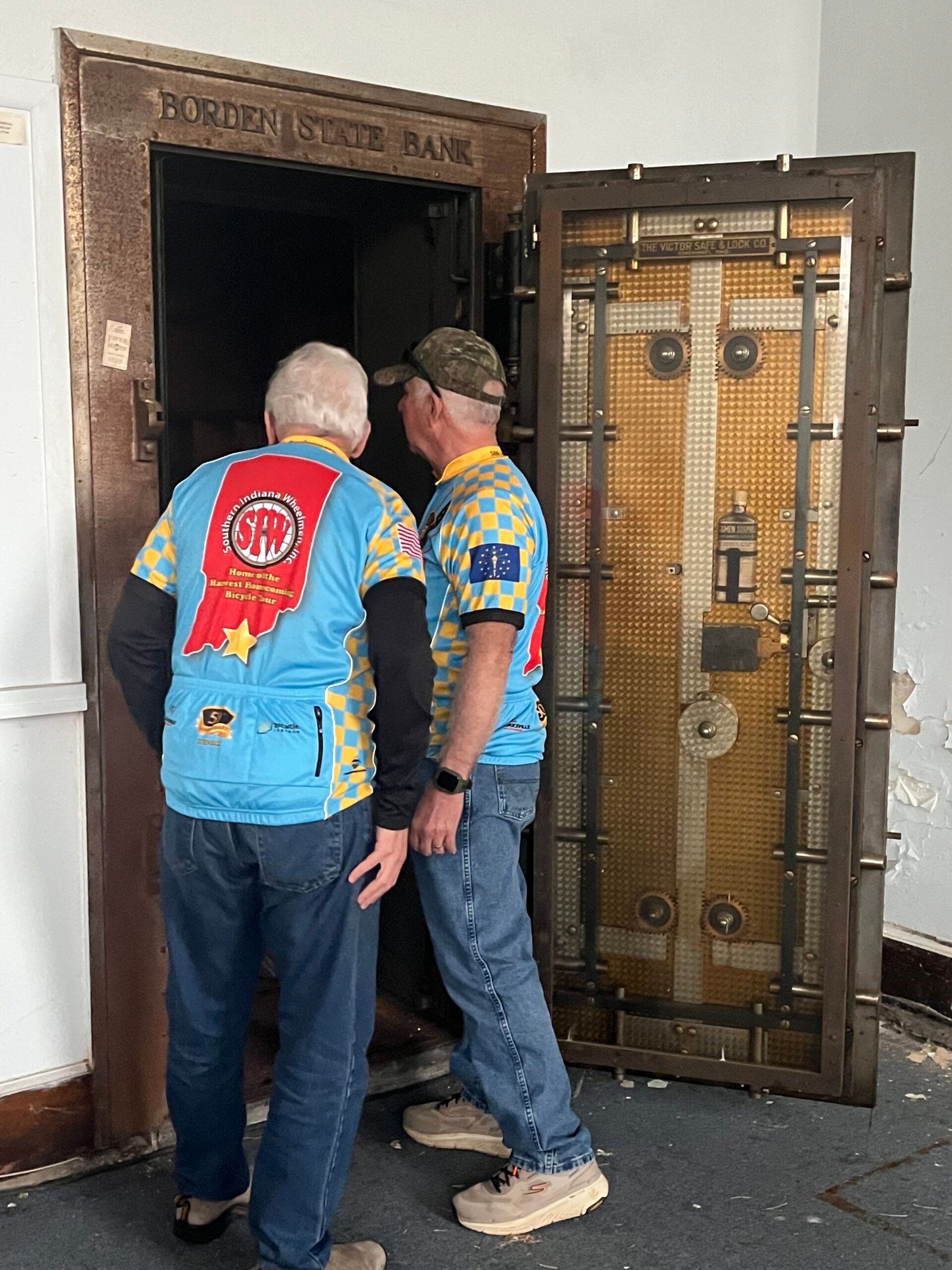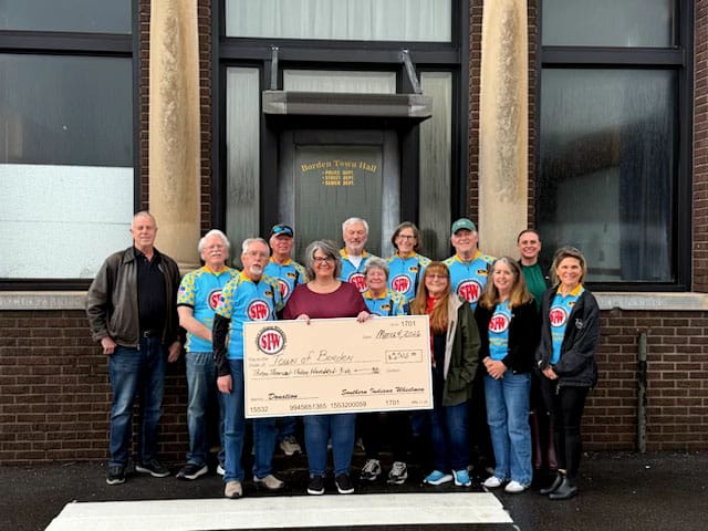 The Southern Indiana Wheelmen delivered a check for $3,305 Wednesday to the Town of Borden and Radius Indiana. The town plans to restore the 1900-era Borden State Bank building by turning it into a new public restroom facility. The former bank, which at one time served as Borden Town Hall, is in an ideal location for serving the trail. It is located across from the trailhead, is close to Borden Town Hall and Borden High School. The Borden trailhead offers several amenities, including seating, shade and access to 24-Hour Trail Snacks & Drinks.