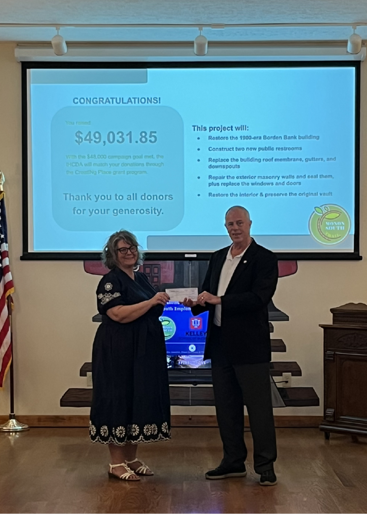 Another new development along the trail is the Town of Borden’s upcoming restoration of the 1900-era Borden State Bank Building as they turn the building into restroom facilities for trail users. Celebrating their recent success in making this project come to life through a IHCDA CreatINg Places crowdfunding campaign, Radius Indiana presented Borden with a check for the $49,031 raised.